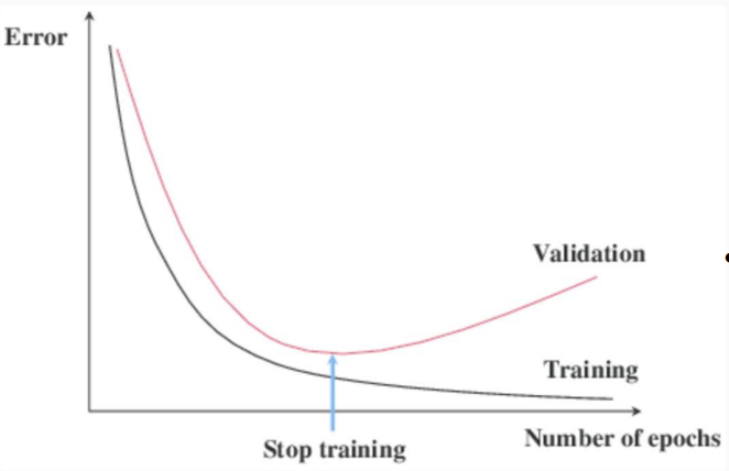 We should monitor validation loss after each epoch. If it starts increasing while training loss keeps decreasing → overfitting. We stop training then, and this acts as a regularizer, it prevents the network from memorizing noise.