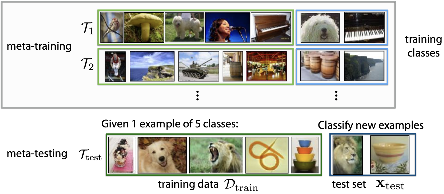 Meta-train on many tasks, then meta-testing involves 1 task with 1 or 5 examples
