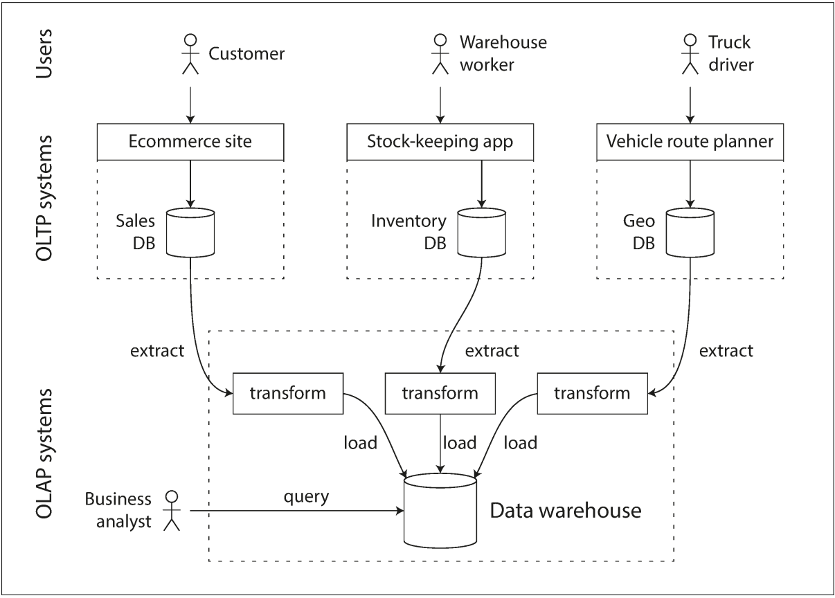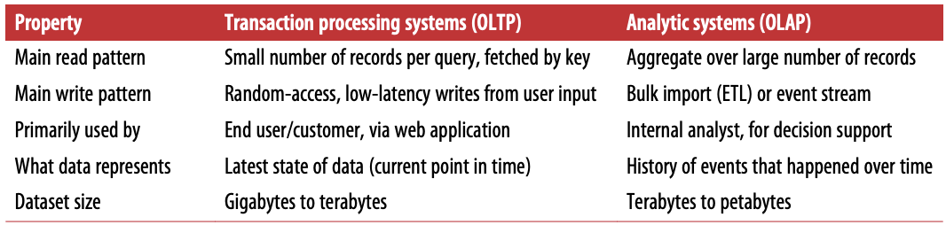 SQL databases although born for OLTP necessities, actually work quite well for OLAP. Nevertheless, OLTP systems shouldnât be used for analytics, and a need for a separate database (called a data warehouse) came up.